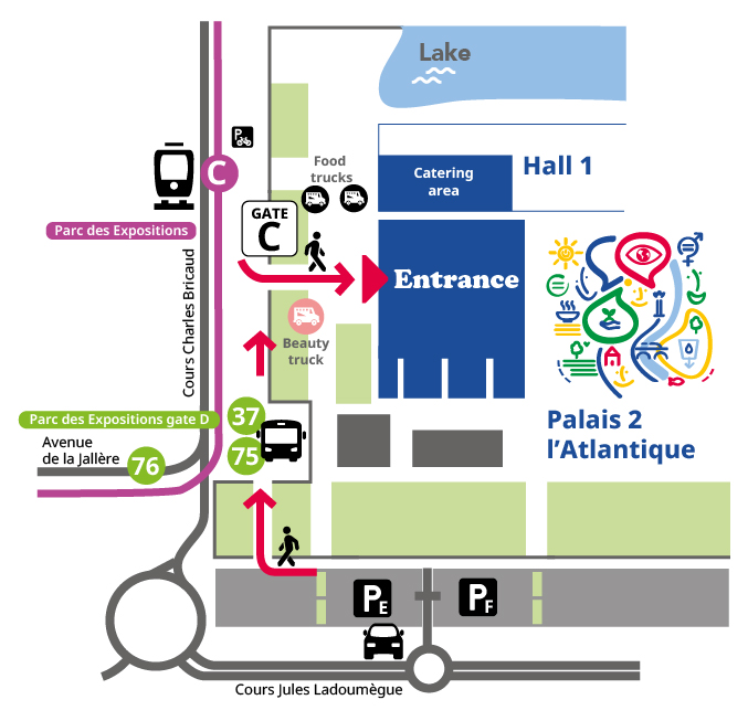 • Palais 2 de l'Atlantique is served from the centre of Bordeaux by Tram C – Parc des Expositions stop (please note: take the tram towards BORDEAUX Parc des Expositions Stade).
