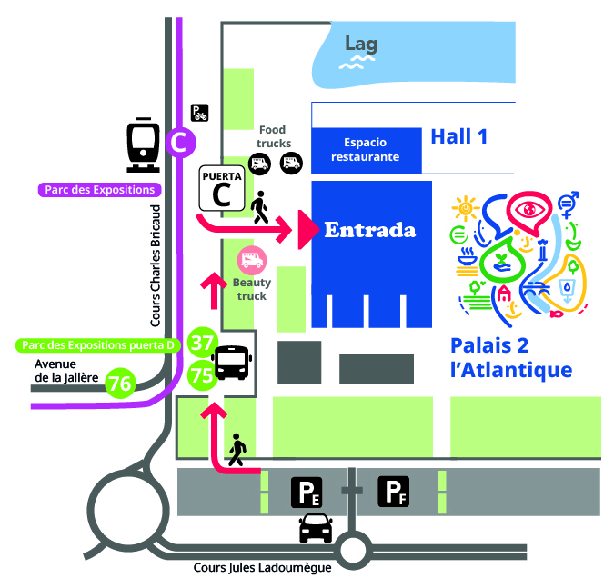 - El Palais 2 de l'Atlantique está comunicado con el centro de Burdeos por el tranvía C - Parada Parc des Expositions (atención: tome el tranvía en dirección a BORDEAUX Parc des Expositions Stade).
