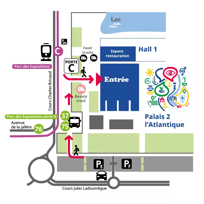 - Le Palais 2 de l’Atlantique est desservi depuis le centre de Bordeaux par le Tram C – Arrêt Parc des Expositions (attention bien prendre un tram direction BORDEAUX Parc des Expositions Stade).