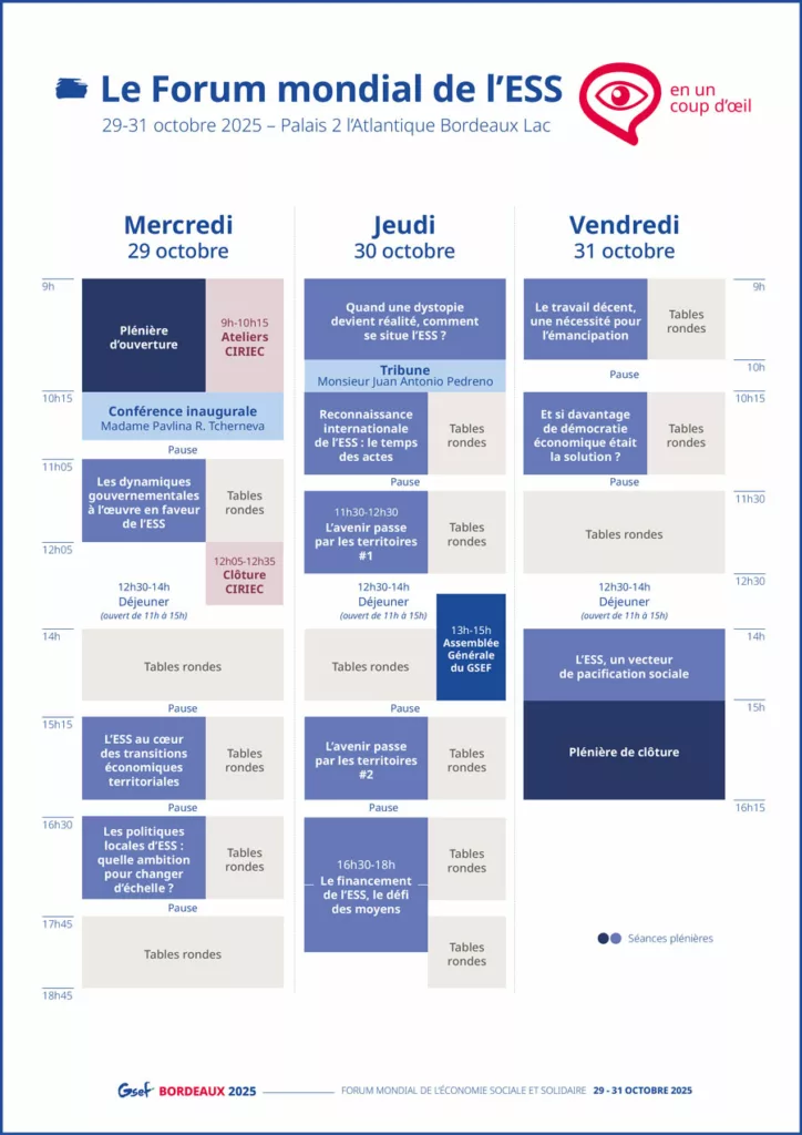 - Des événements spécifiques : AG du Réseau GSEF et Ateliers CIRIEC et clôture – Conférence internationale de recherche en ESS CIRIEC